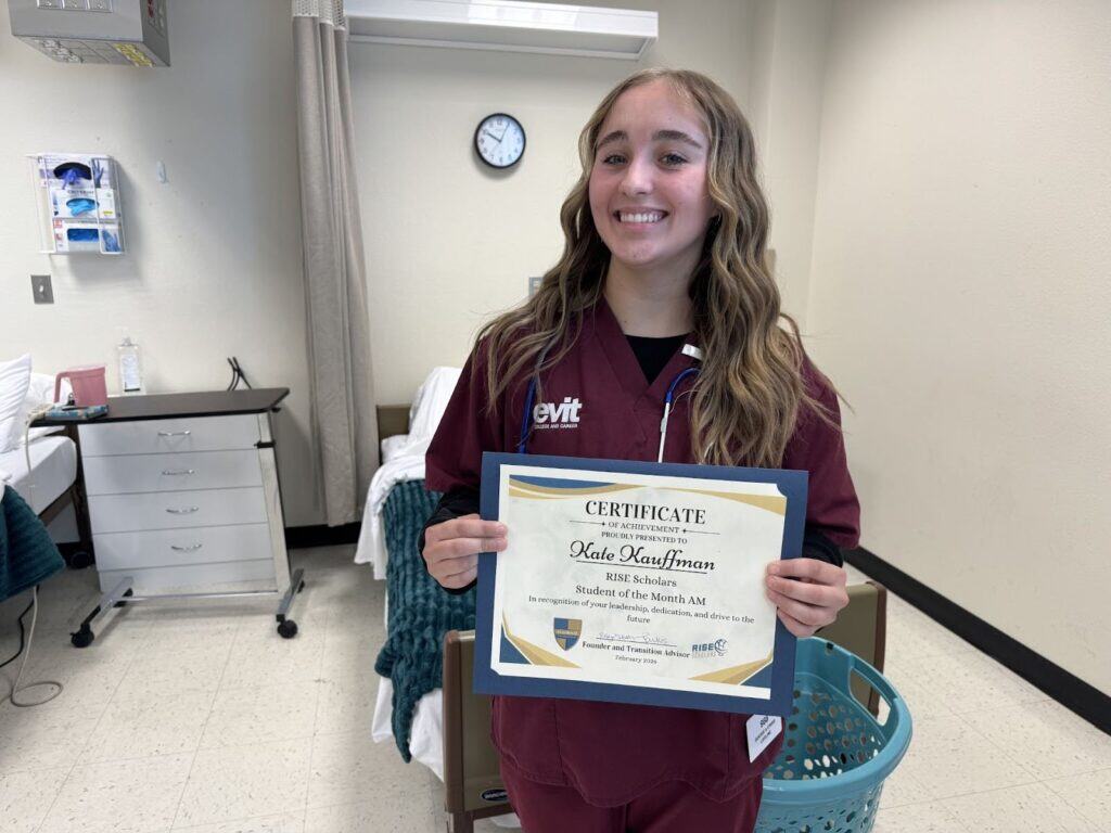 Two health sciences students, Kate Kauffman (AM) and Mario Torres (PM), are being recognized by their EVIT teachers for their outstanding performance.