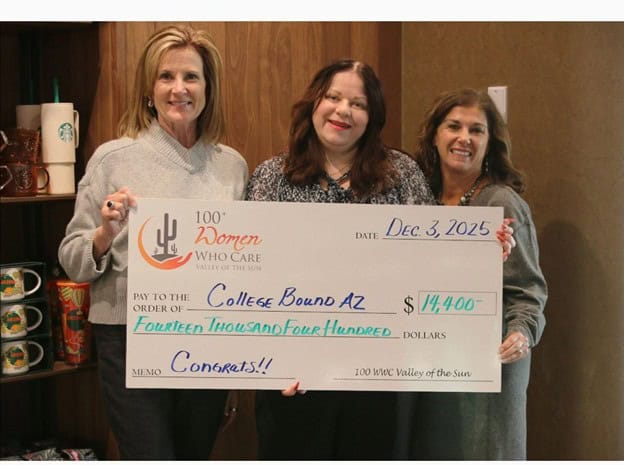 In an unforgettable evening, the Ahwatukee Chapter of 100 Women Who Care Valley of the Sun selected College Bound AZ to receive its quarterly donations to strengthen “a place where dreams are lifted, barriers are dismantled, and futures are rewritten with love and intention.”