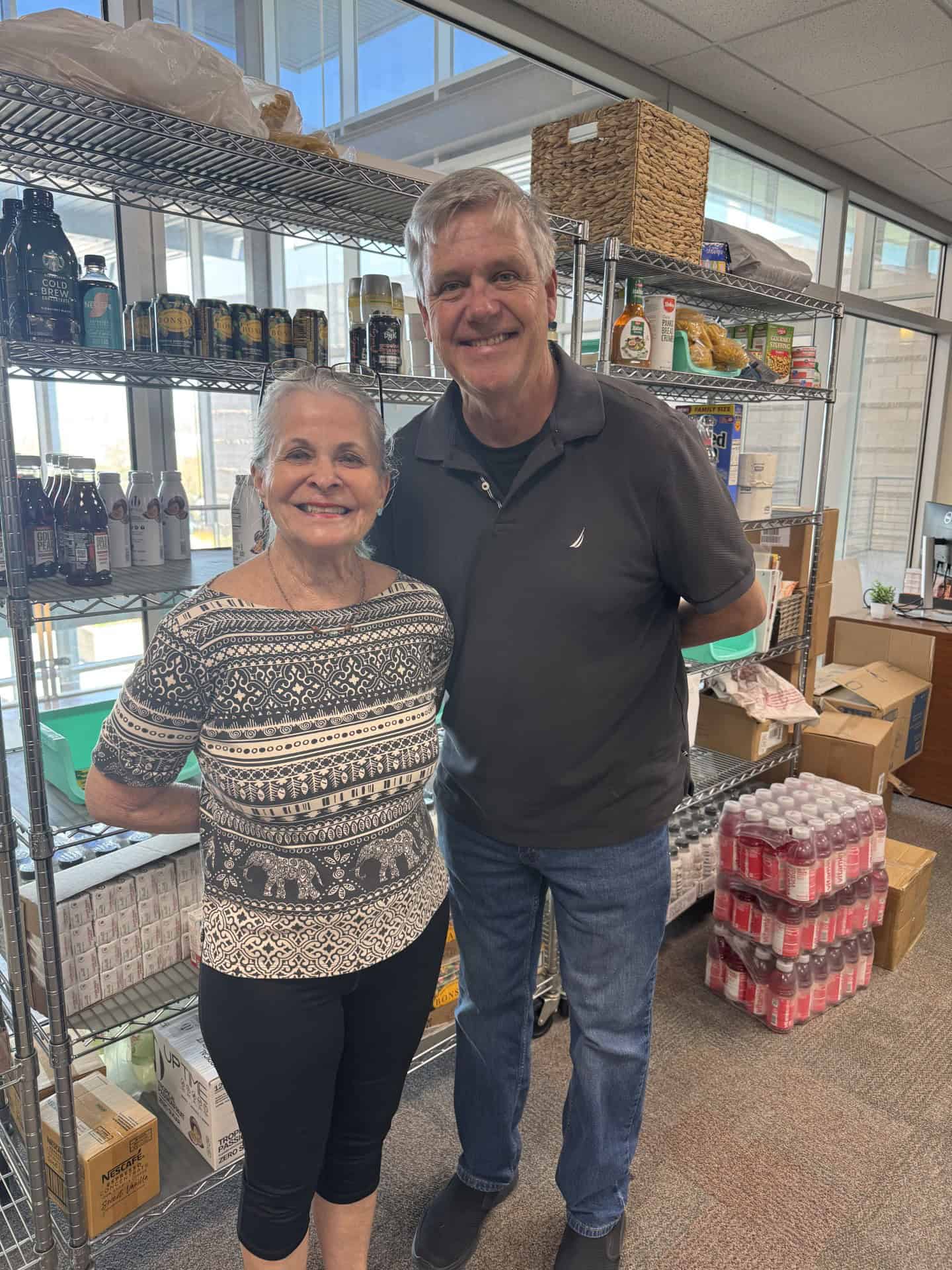 Volunteers Juanita Dominguez and Kevin Haasarud keep the food pantry stocked and organized. Thank You!